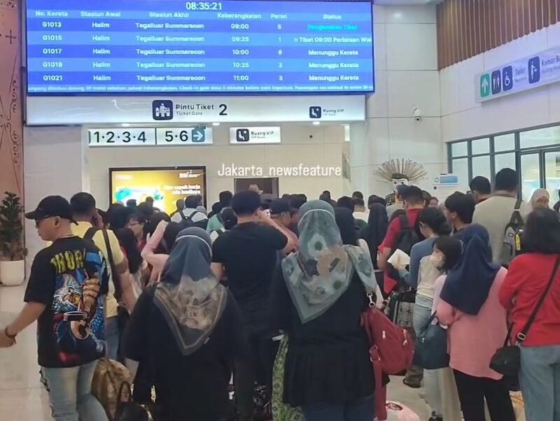 JAKARTA, news.devilo.co – Stasiun kereta cepat Whoosh Halim ramai dipadati penumpang pada libur panjang Isra Miraj. Antrean penumpang terlihat di loket penjualan tiket.