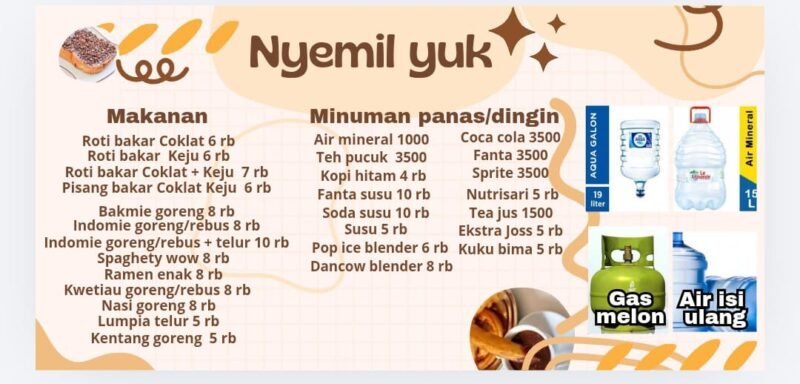 Mengutamakan konsep sederhana namun mengenyangkan, “Nyemil Yuk” menawarkan beragam camilan dengan harga terjangkau yang disesuaikan dengan kondisi ekonomi masyarakat sekitar. Mulai dari jajanan pisang bakar, roti bakar, cemilan kekinian, hingga minuman ringan, semuanya disajikan dengan porsi pas dan cita rasa yang tetap terjaga.